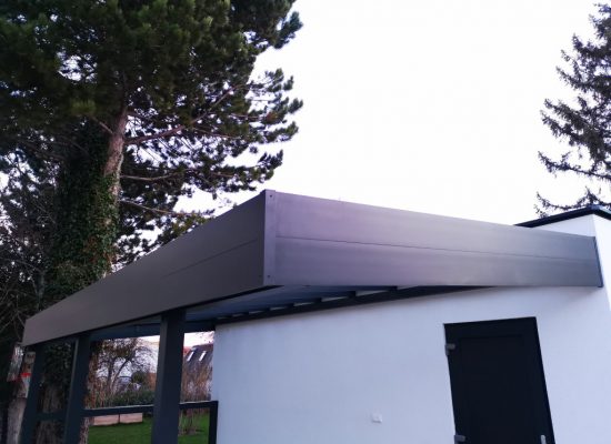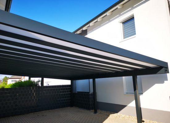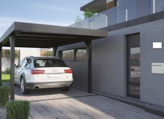 Neben den klassischen Pultdach-Carports gewinnt seit Längerem eine neue Variation Beliebtheit: Das Flachdachcarport. Von einem herkömmlichen Pultdach unterscheidet sich das Alubram Aluminium Flachdachcarport vor allen Dingen durch seine optisch geringe Neigung. Das Dach erscheint fast eben, ist allerdings um subtile 2% geneigt, damit trotzdem ein ungehinderter Ablauf des Regenwassers gewährleistet werden kann. Dieses wird durch die integrierte Regenrinne in eine innenliegende Wasserführung in den Pfosten abgeleitet. So werden unschöne Regenrohre versteckt.