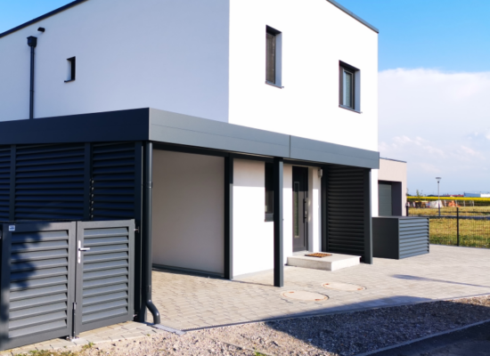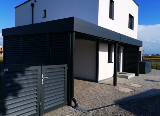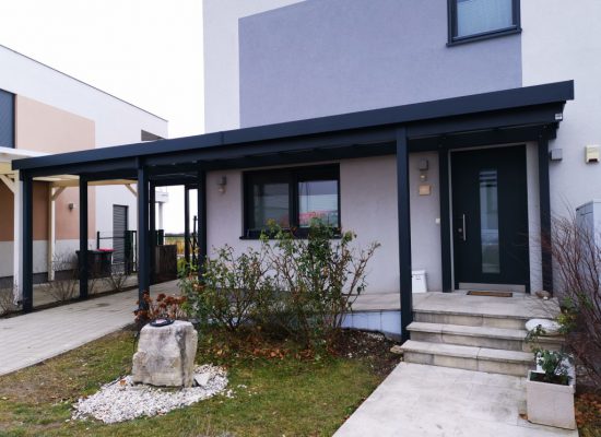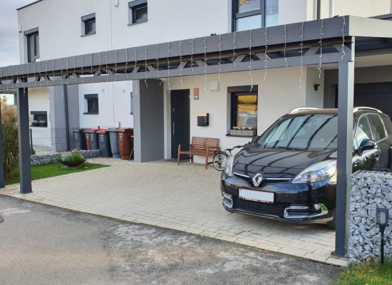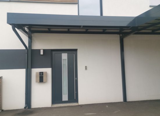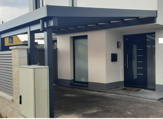 In den meisten Projekten geht es dabei nicht nur um die Integration der Überdachung des Hauseingangs, sondern zusätzlich um die Kombination von Schuppen, Sichtschutz, Müll Einhausung oder Zugangsmöglichkeiten durch Türen in den Gartenbereich. Durch die Anbindung der Eingangsüberdachung an den Carport aus Metall entsteht, im Gegensatz zu einer separaten Überdachung der Haustür, eine Art von Laubengang. So gelangt man trockenen Fußes komfortabel zum Carport und zurück. Die harmonische Gestaltung des Hauseingangs mit seitlichen Verkleidungen, sowie der versteckte Einbau von Beleuchtungselementen sind weitere Vorteile der Integrierten Eingangsüberdachung.