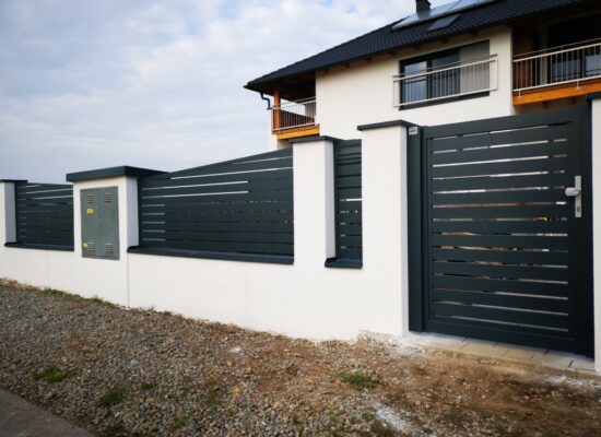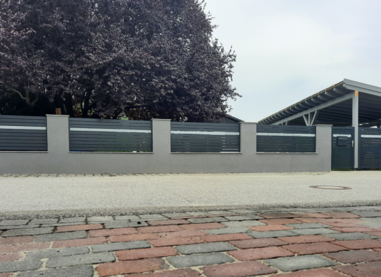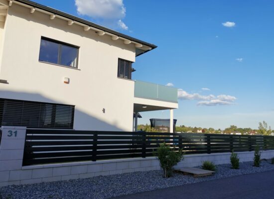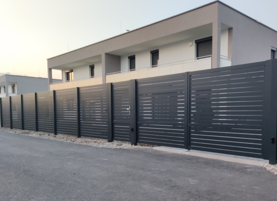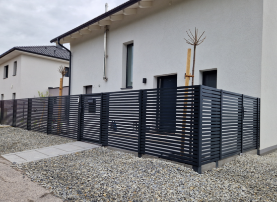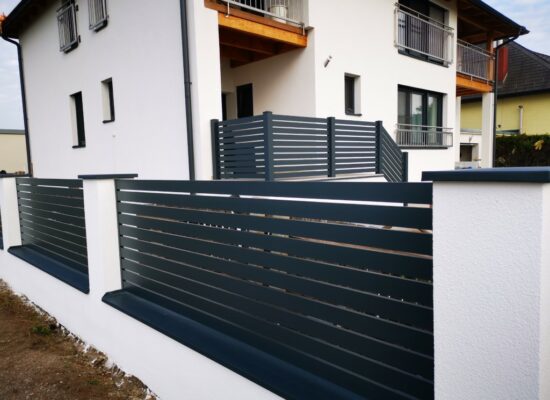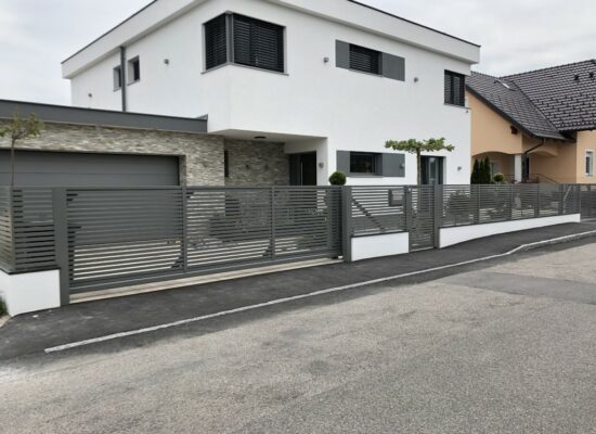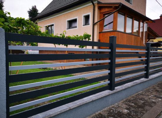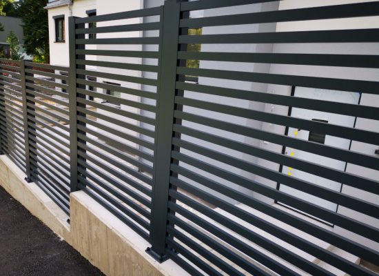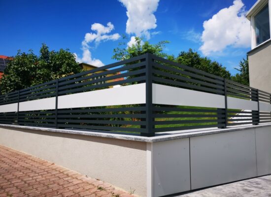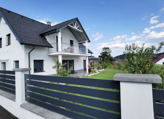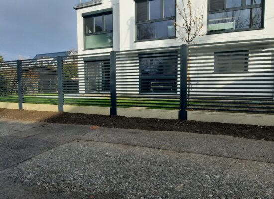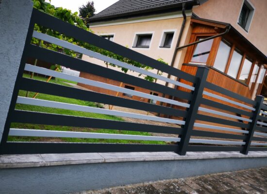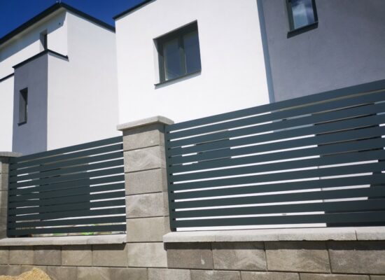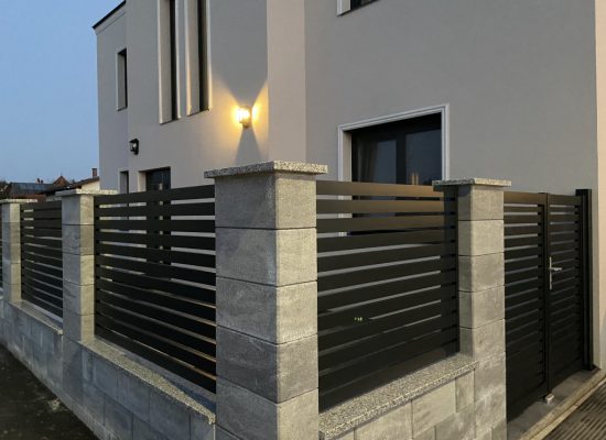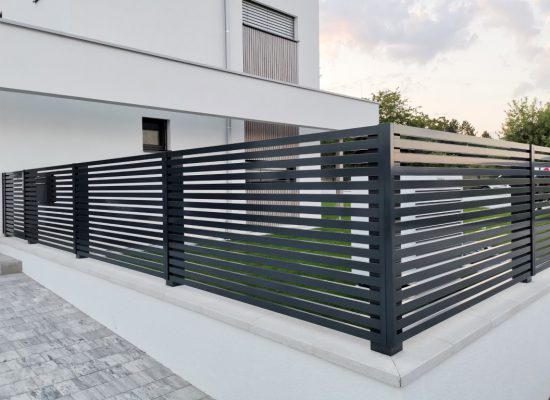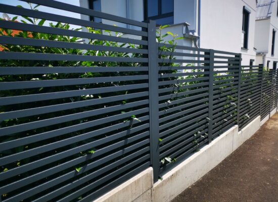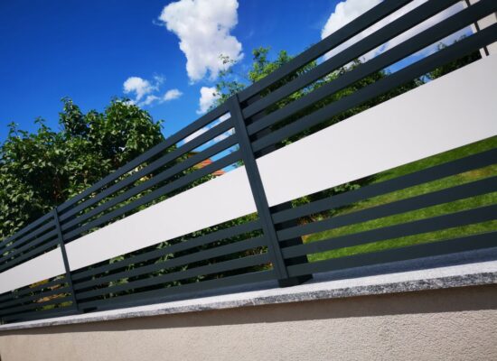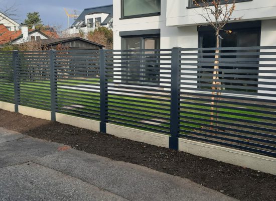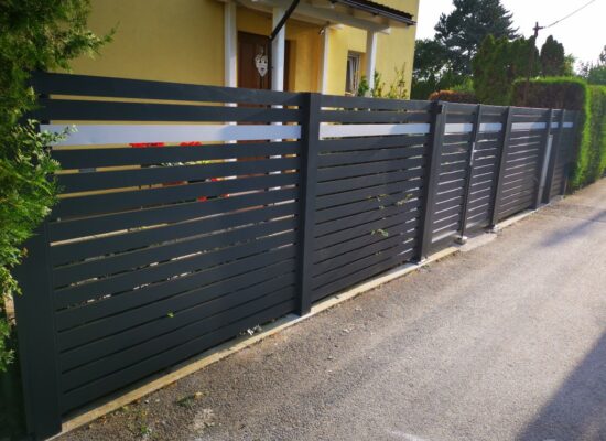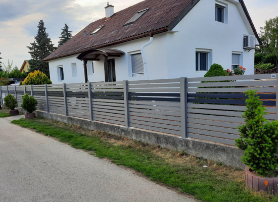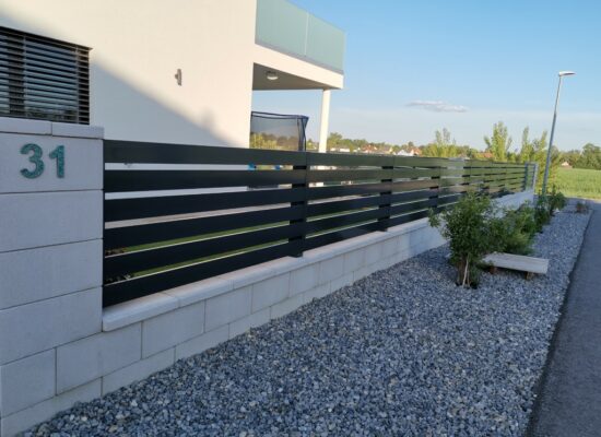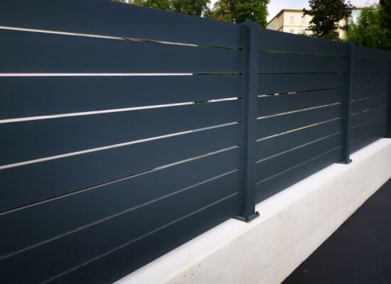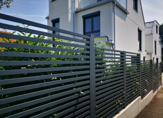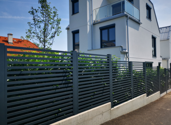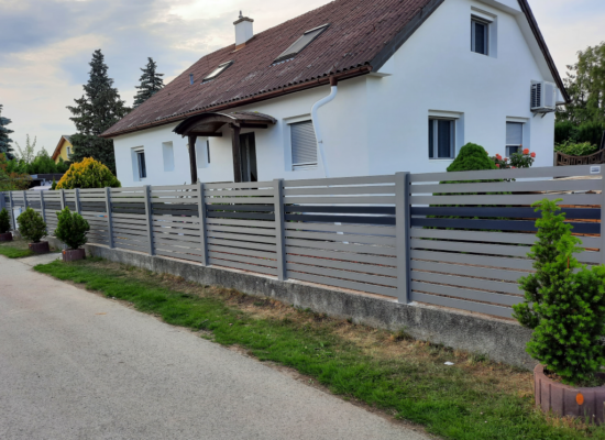 Horizontalzaun passt perfekt zum modernen Bauen. Ein Aluminiumzaun mit horizontalen Profilen ist die richtige Wahl für die Umzäunung eines Grundstücks mit einem einfachen Haus, vorzugsweise mit einem Flachdach.