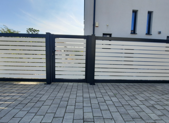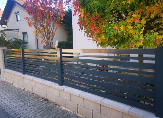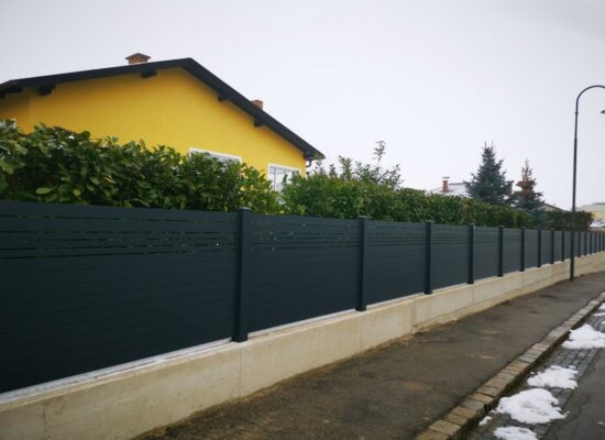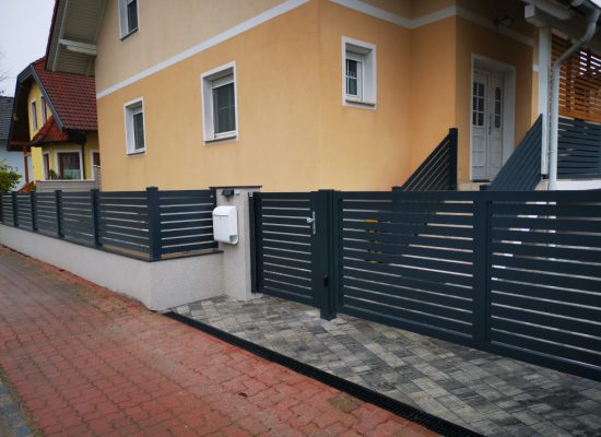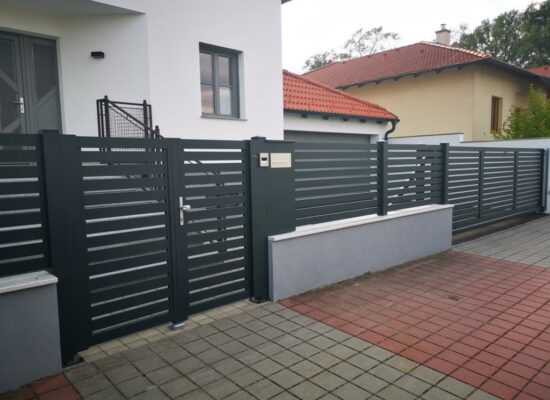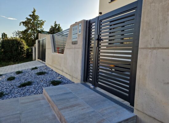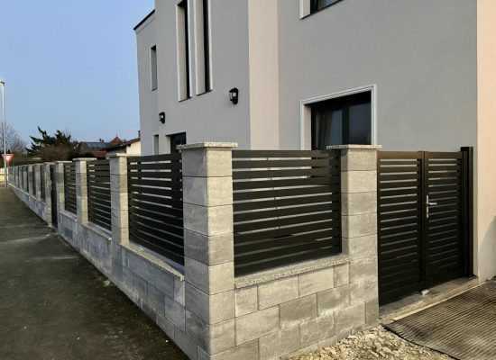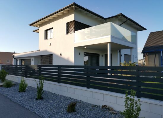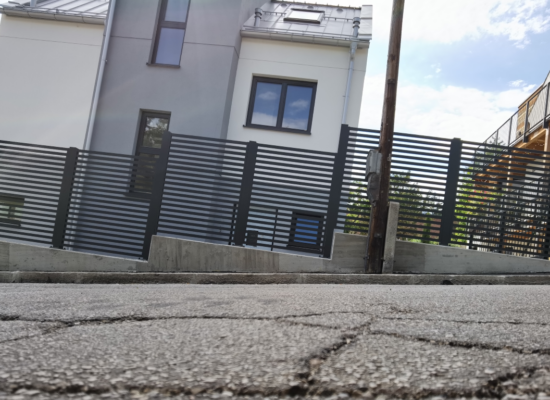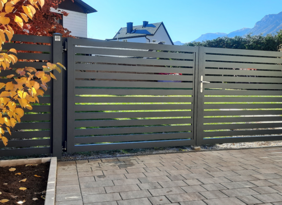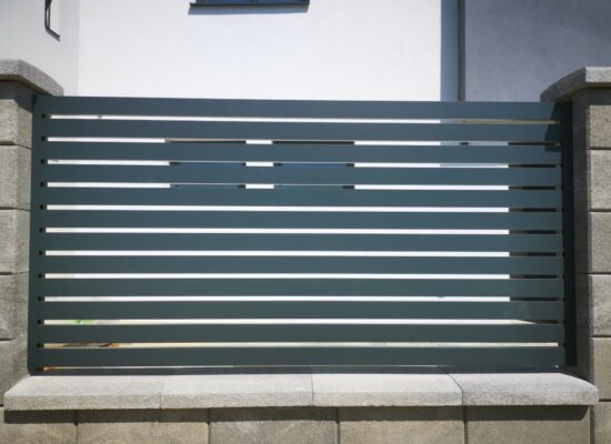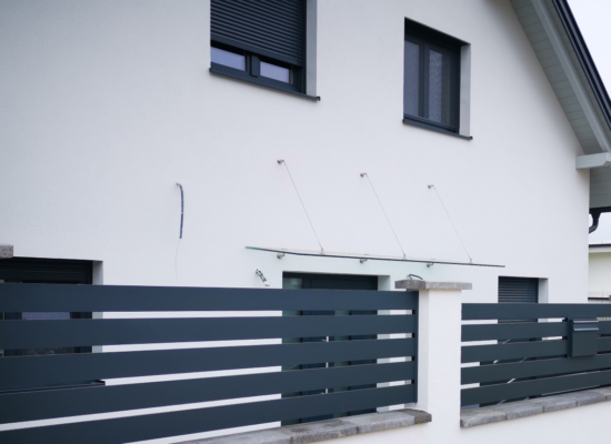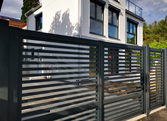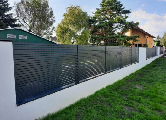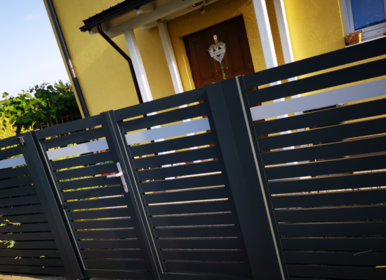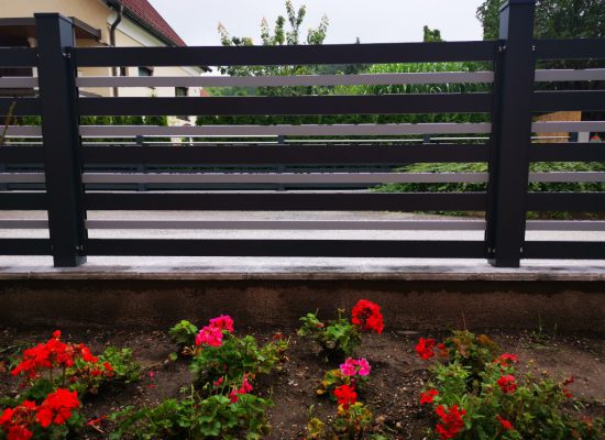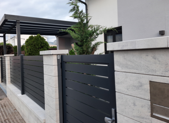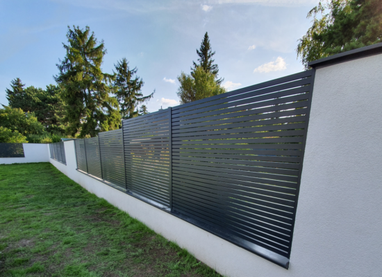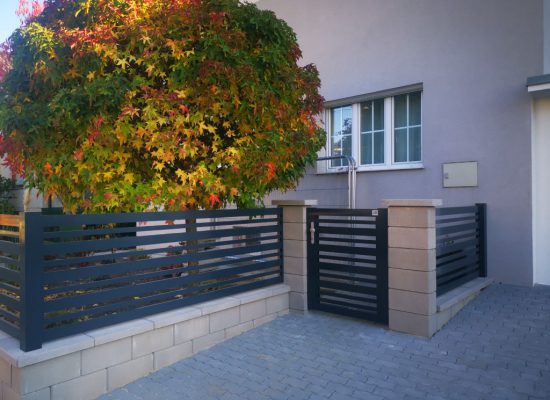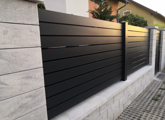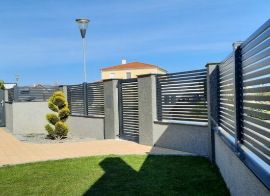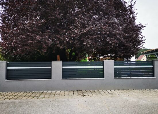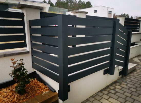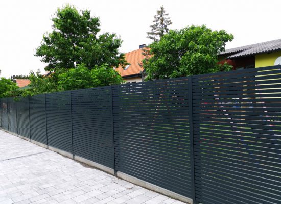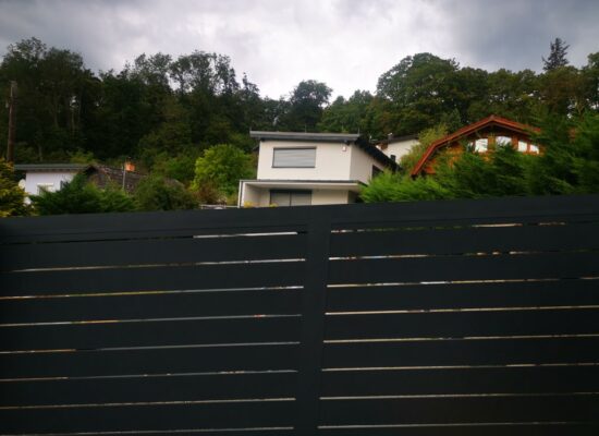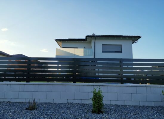 Horizontalzaun passt perfekt zum modernen Bauen. Ein Aluminiumzaun mit horizontalen Profilen ist die richtige Wahl für die Umzäunung eines Grundstücks mit einem einfachen Haus, vorzugsweise mit einem Flachdach.