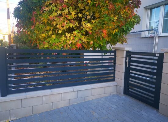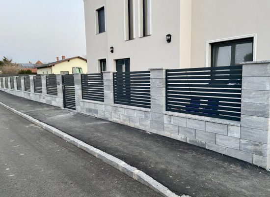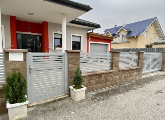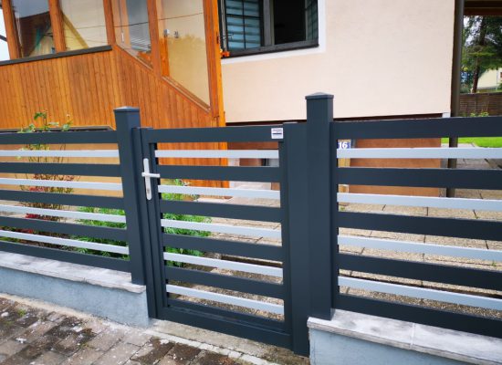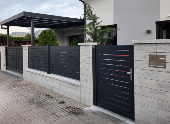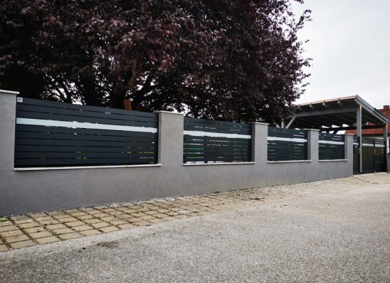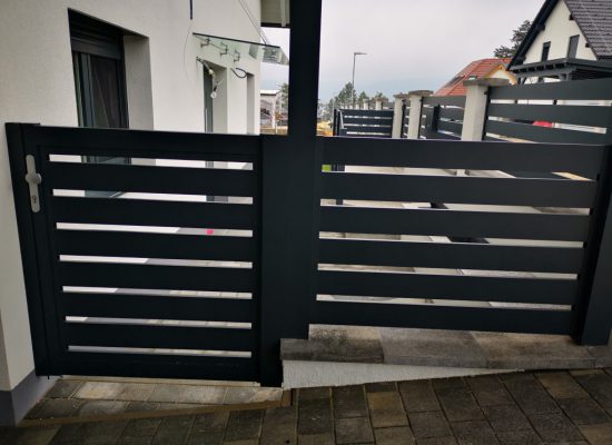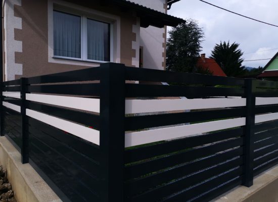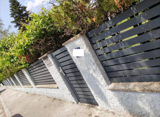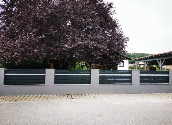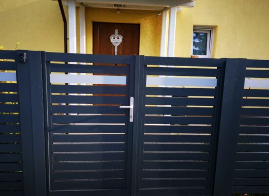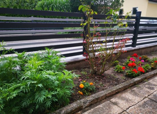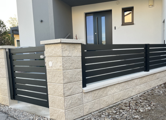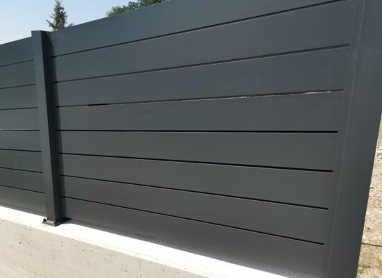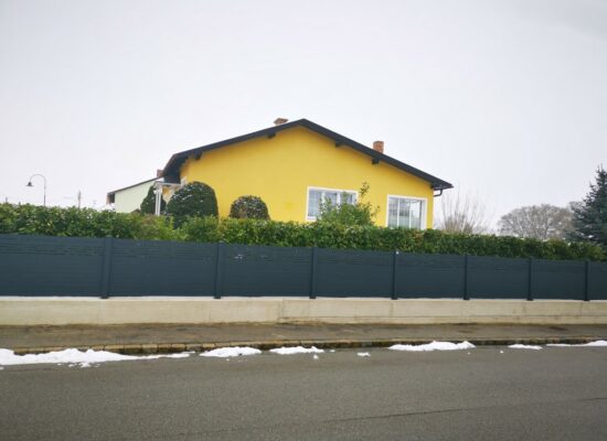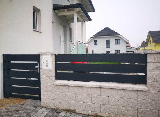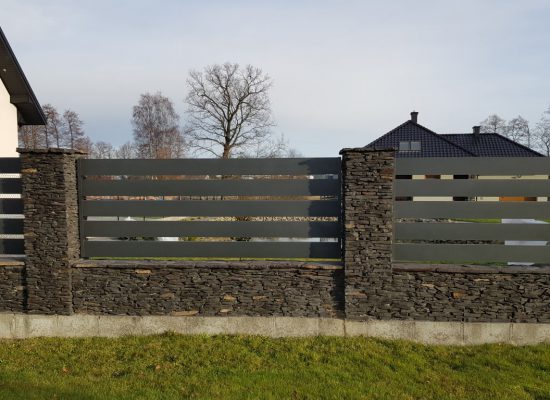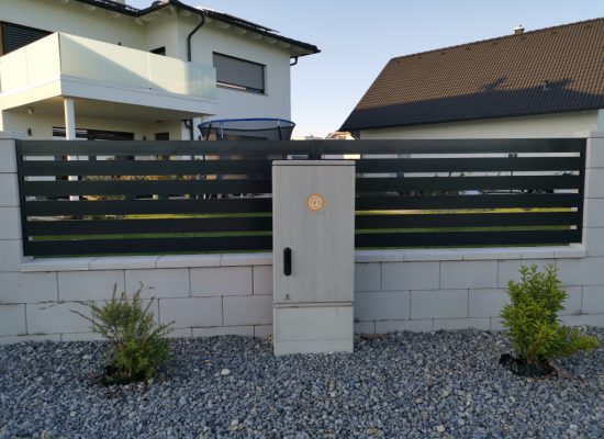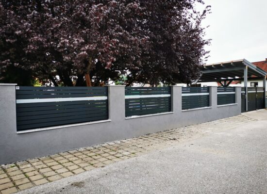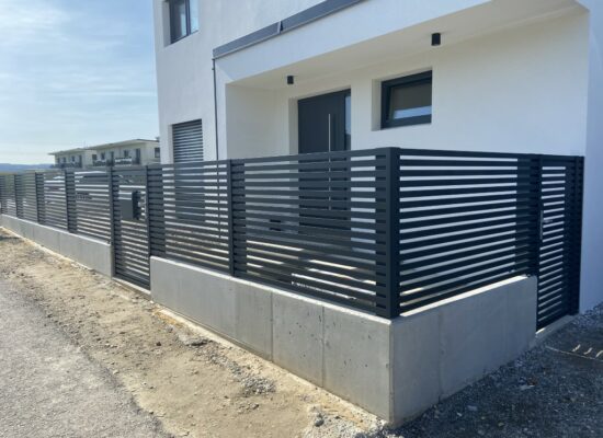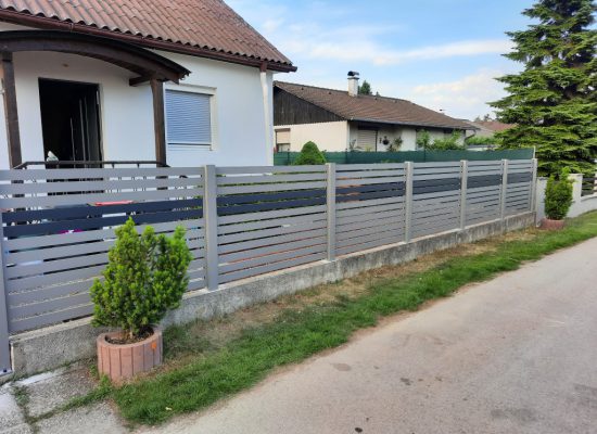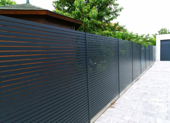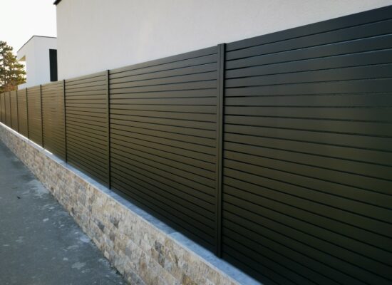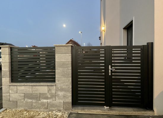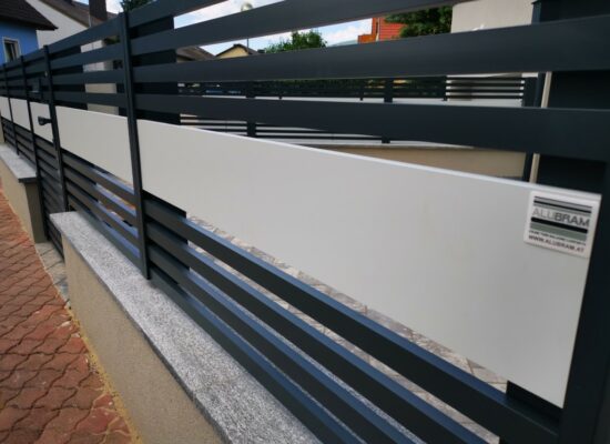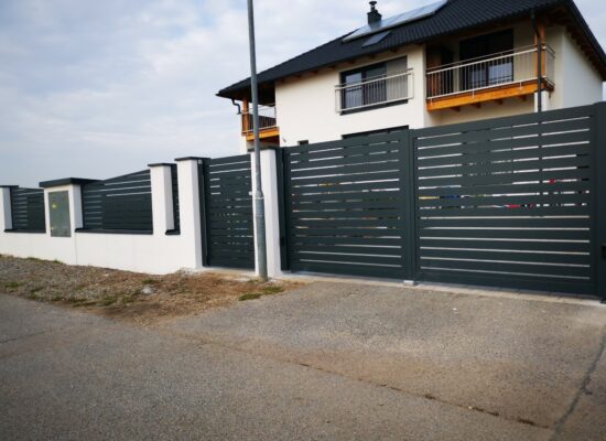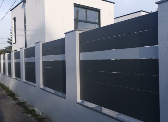 Horizontalzaun passt perfekt zum modernen Bauen. Ein Aluminiumzaun mit horizontalen Profilen ist die richtige Wahl für die Umzäunung eines Grundstücks mit einem einfachen Haus, vorzugsweise mit einem Flachdach.