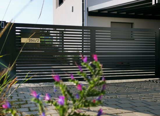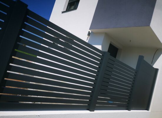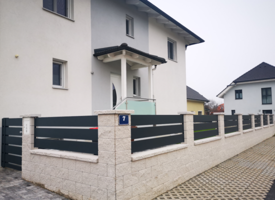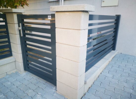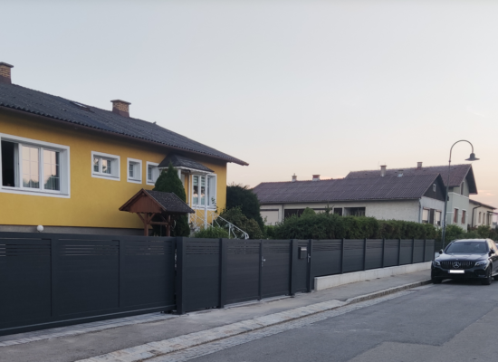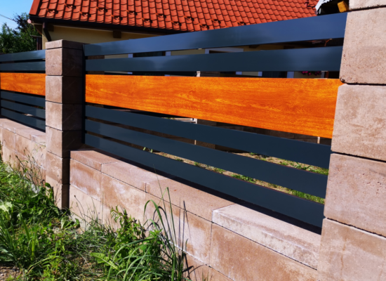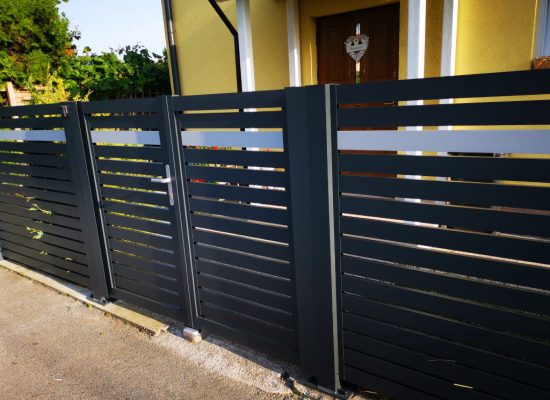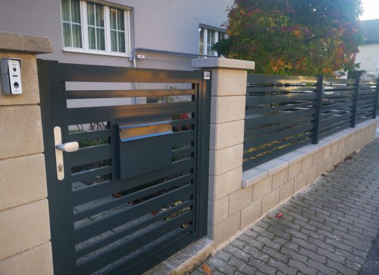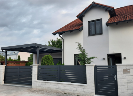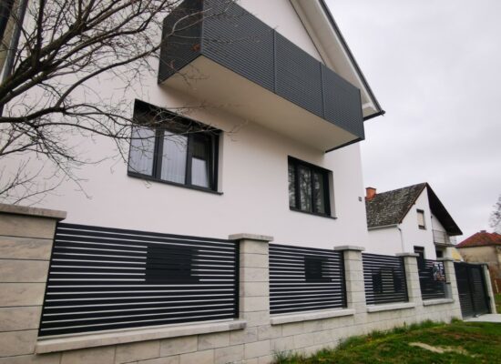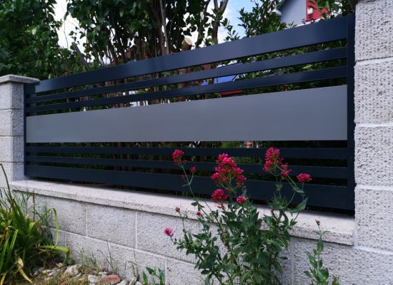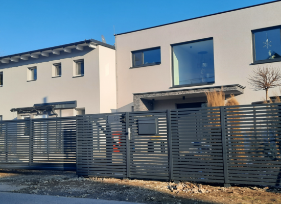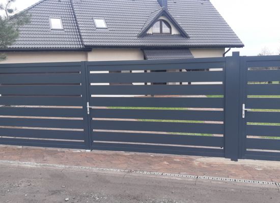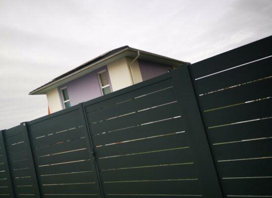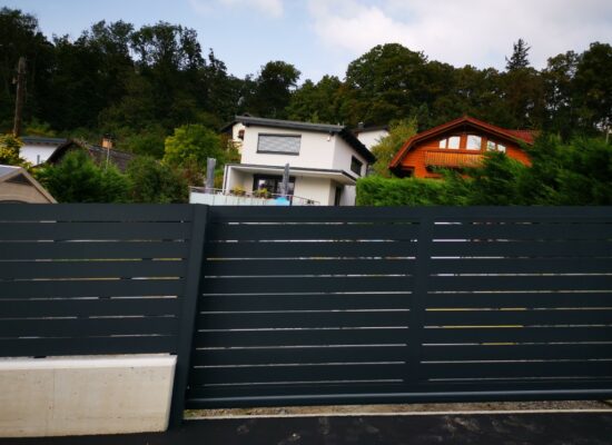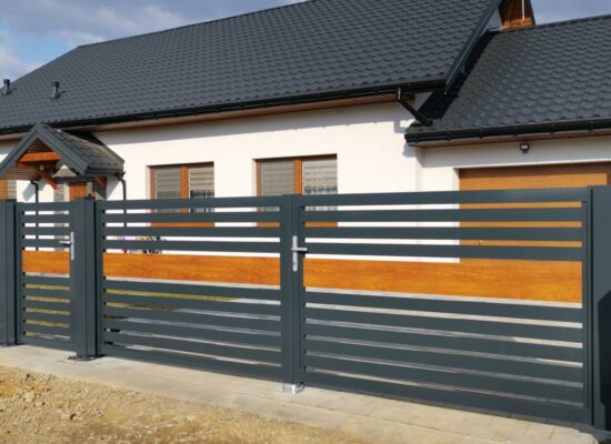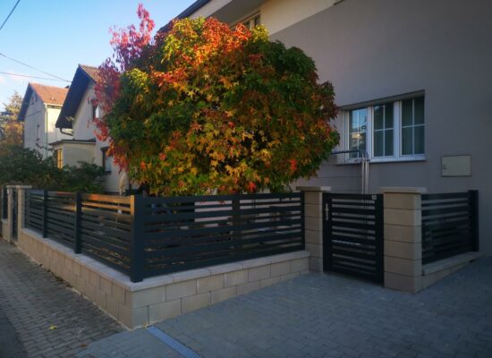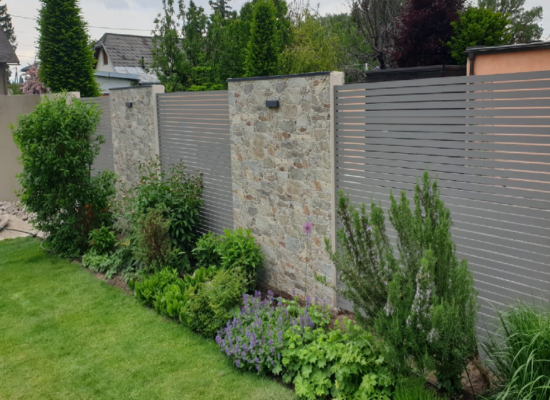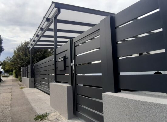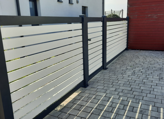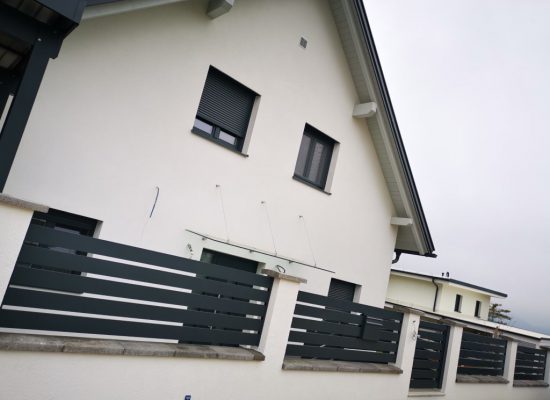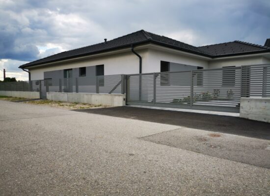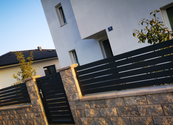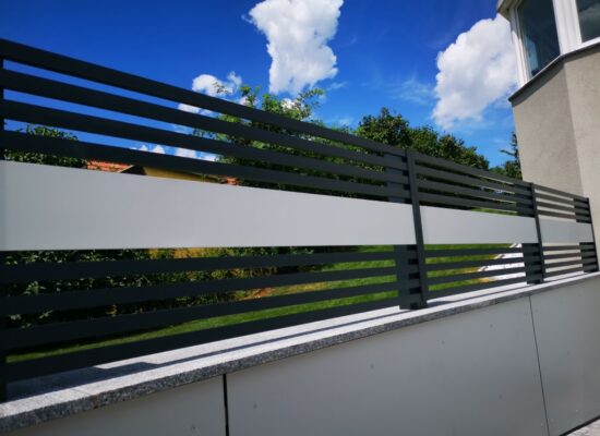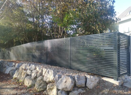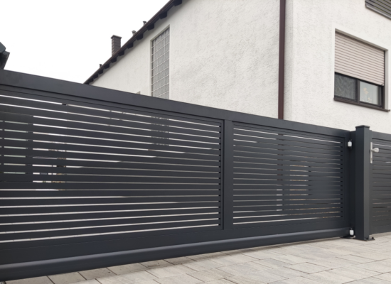 Horizontalzaun passt perfekt zum modernen Bauen. Ein Aluminiumzaun mit horizontalen Profilen ist die richtige Wahl für die Umzäunung eines Grundstücks mit einem einfachen Haus, vorzugsweise mit einem Flachdach.