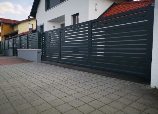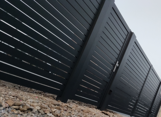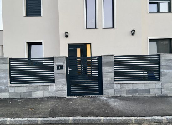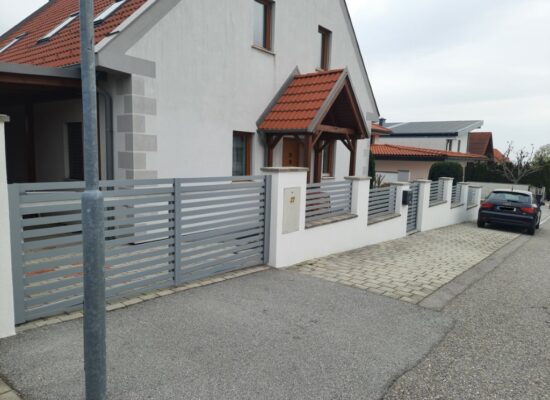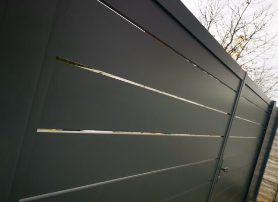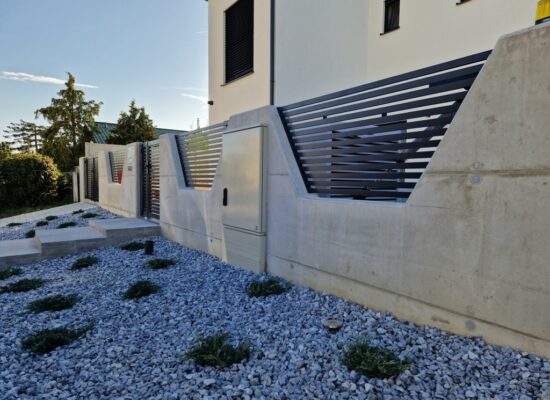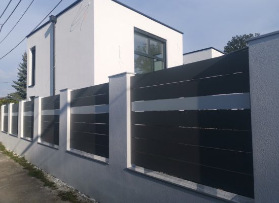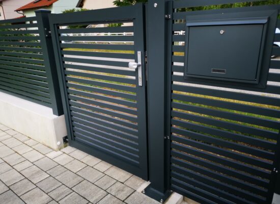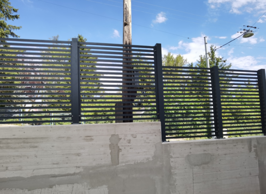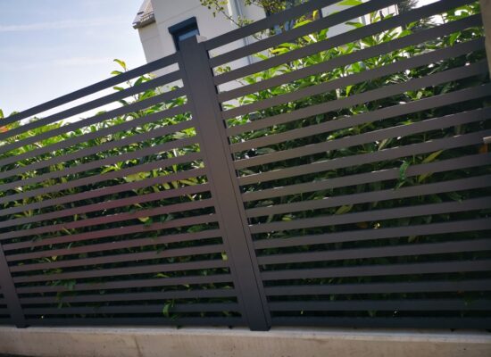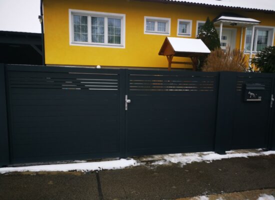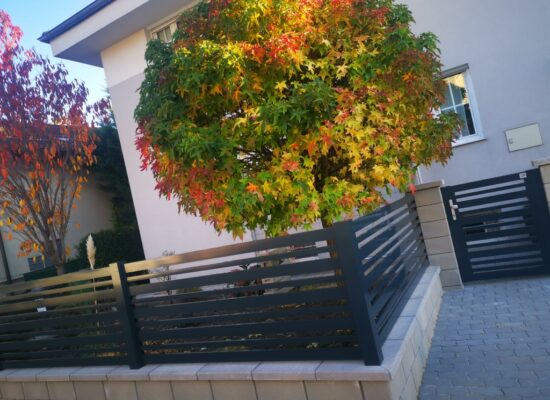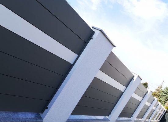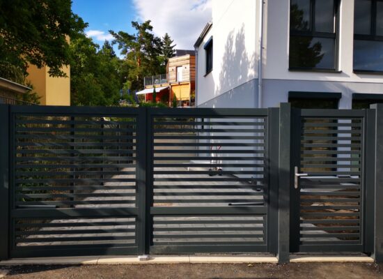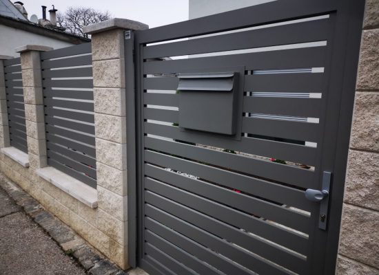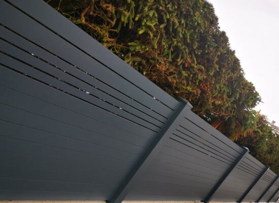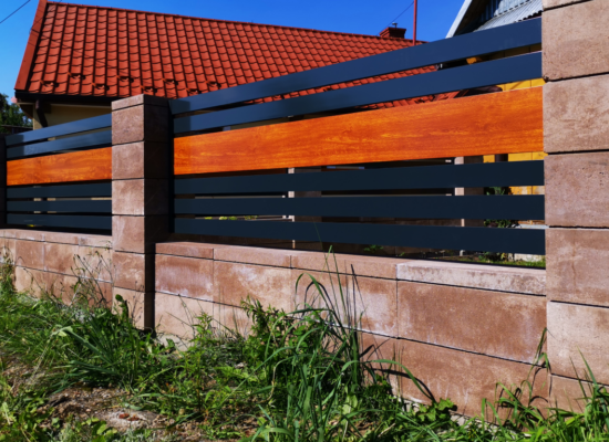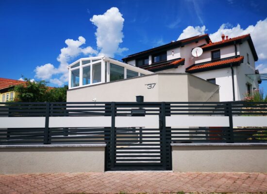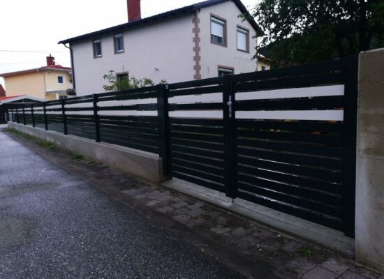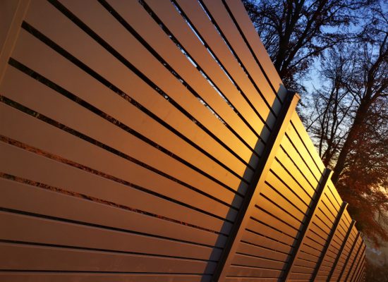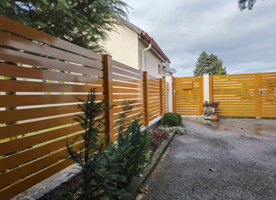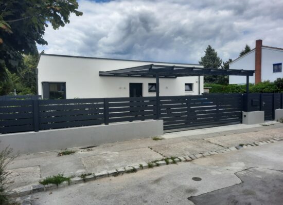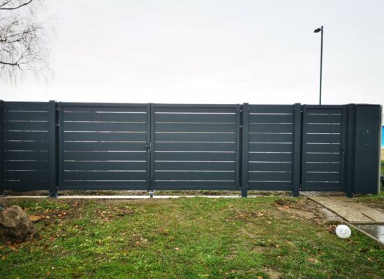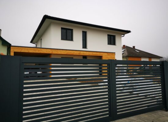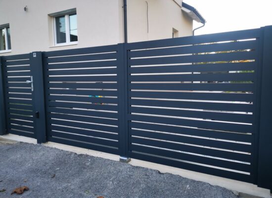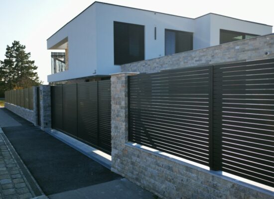 Horizontalzaun passt perfekt zum modernen Bauen. Ein Aluminiumzaun mit horizontalen Profilen ist die richtige Wahl für die Umzäunung eines Grundstücks mit einem einfachen Haus, vorzugsweise mit einem Flachdach.