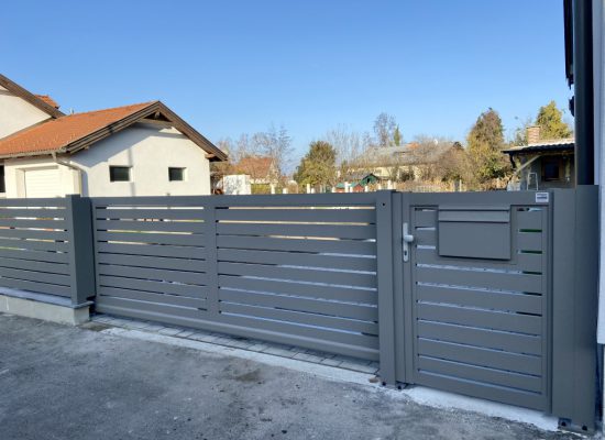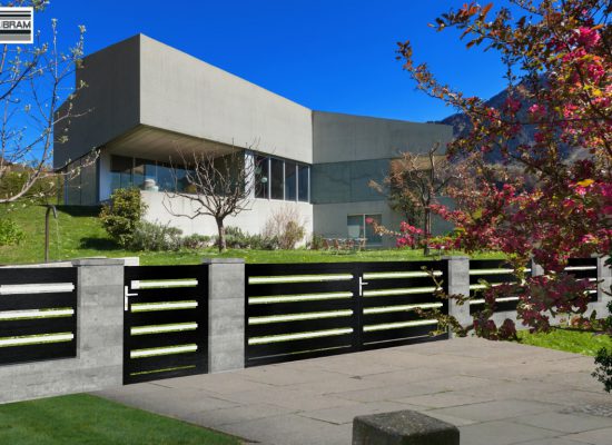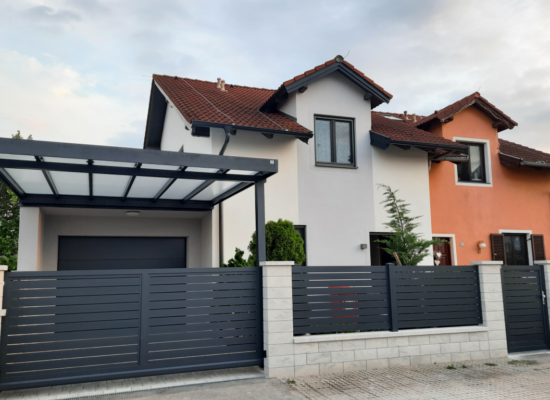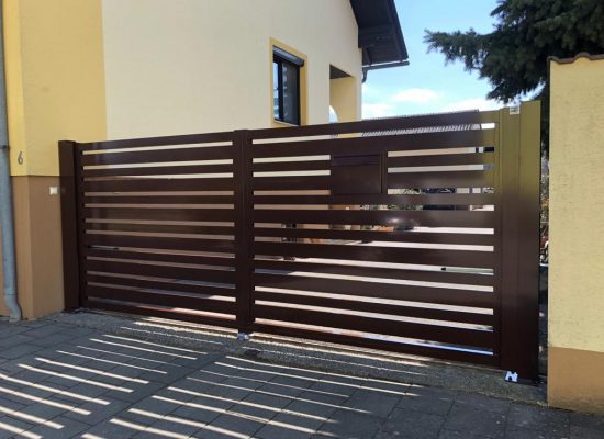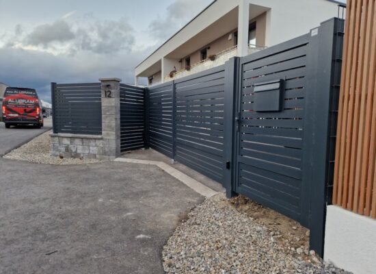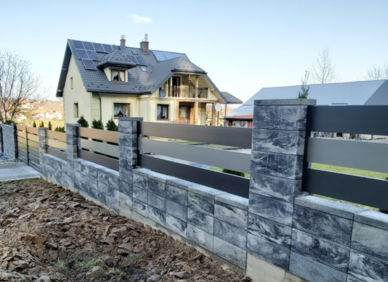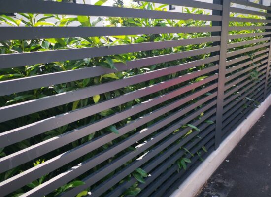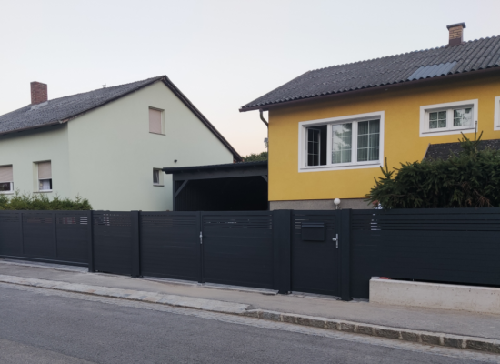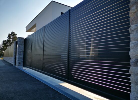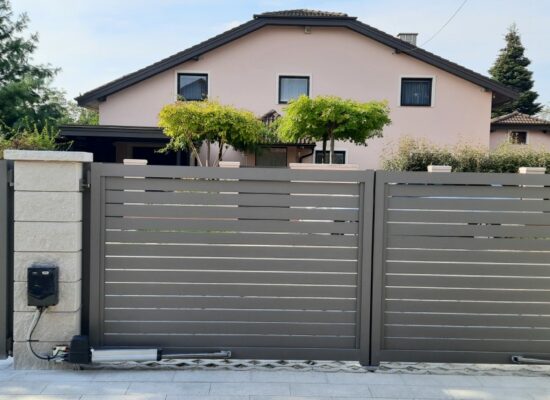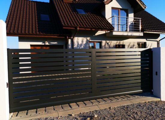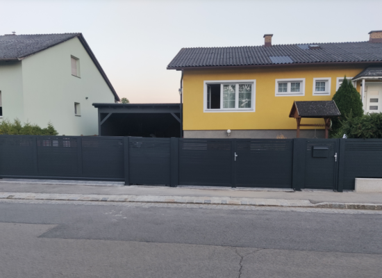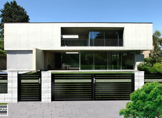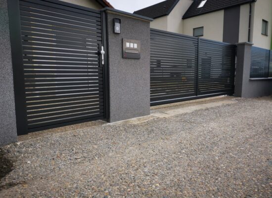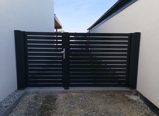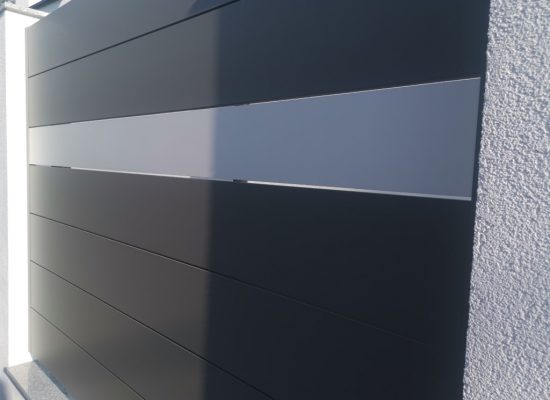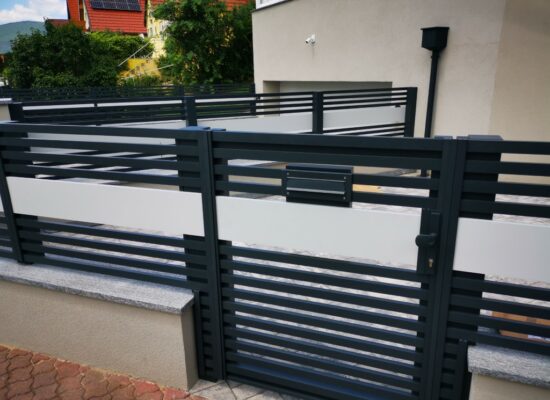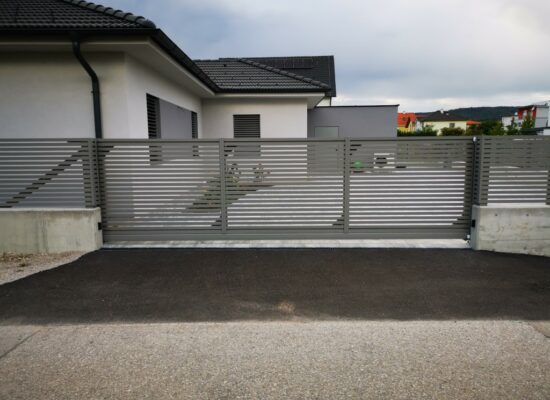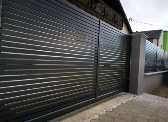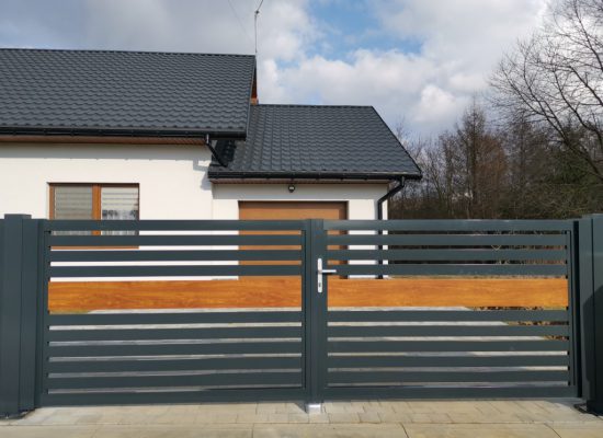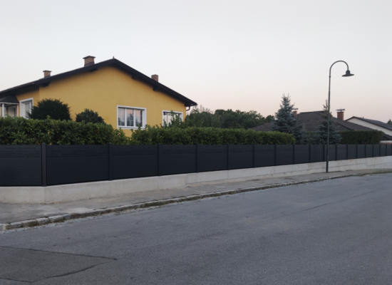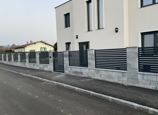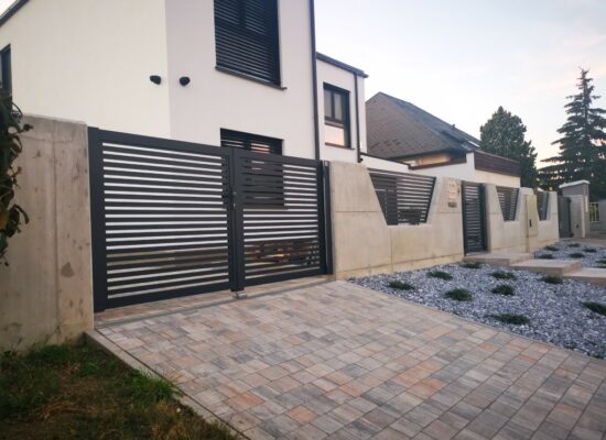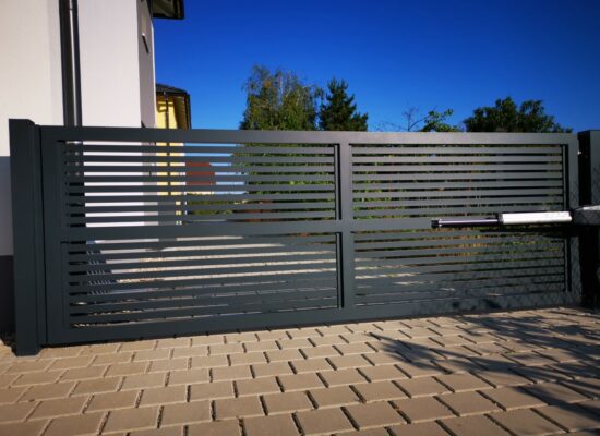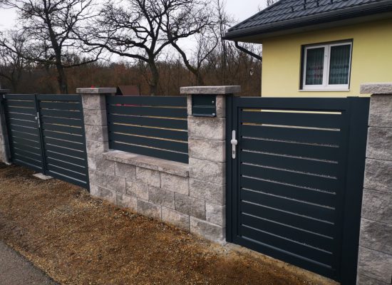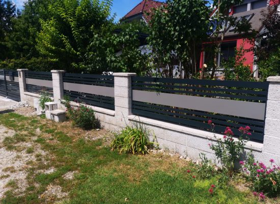 Horizontalzaun passt perfekt zum modernen Bauen. Ein Aluminiumzaun mit horizontalen Profilen ist die richtige Wahl für die Umzäunung eines Grundstücks mit einem einfachen Haus, vorzugsweise mit einem Flachdach.