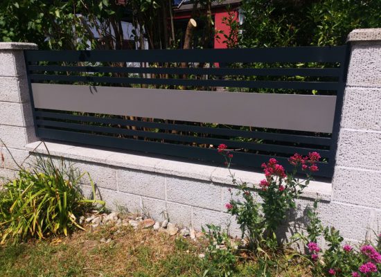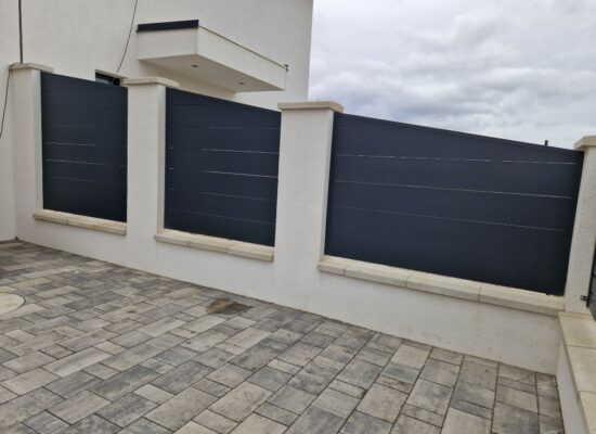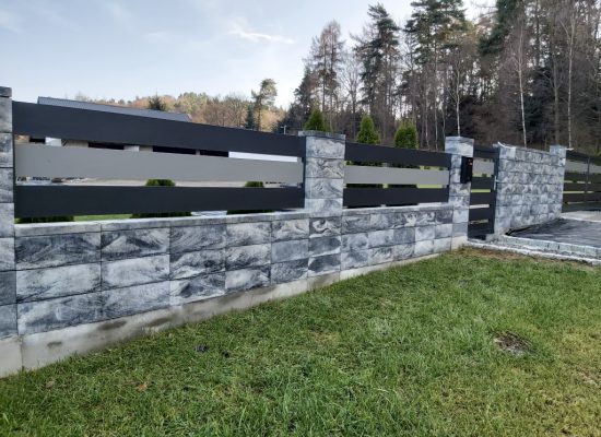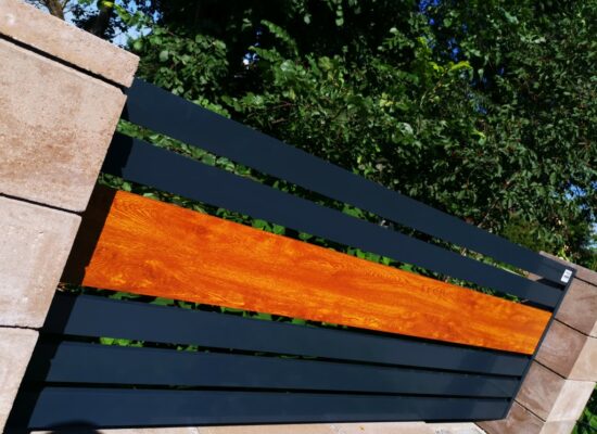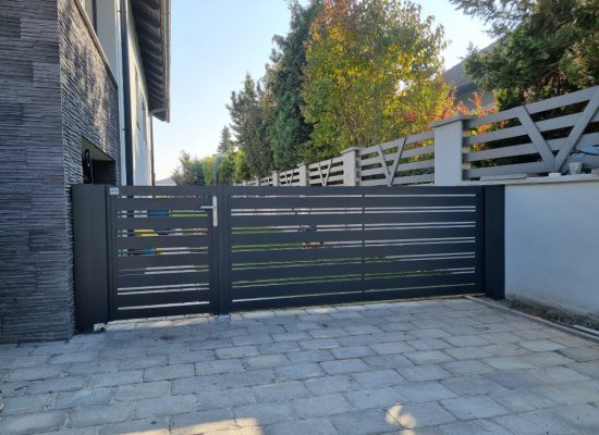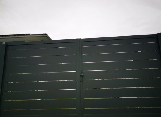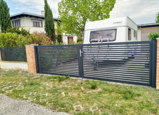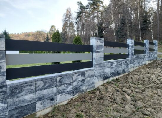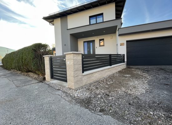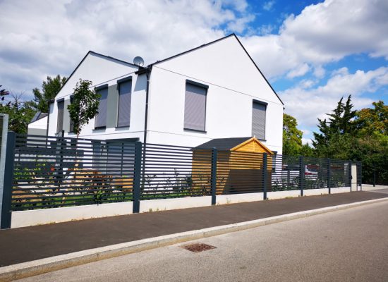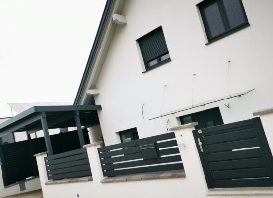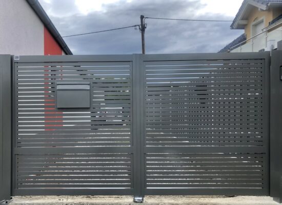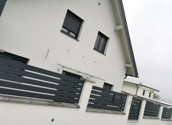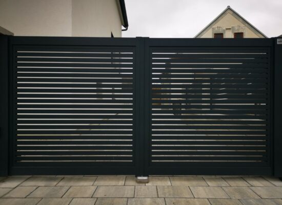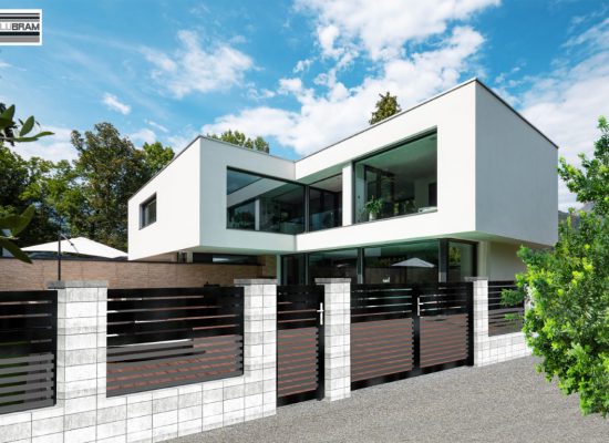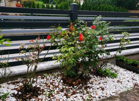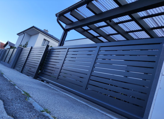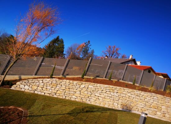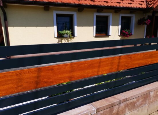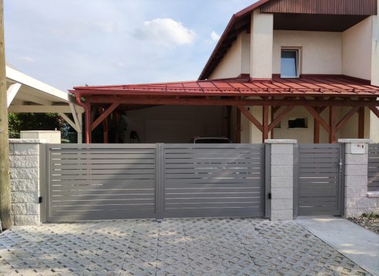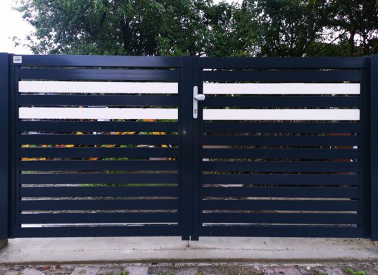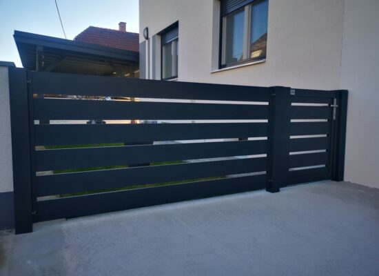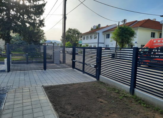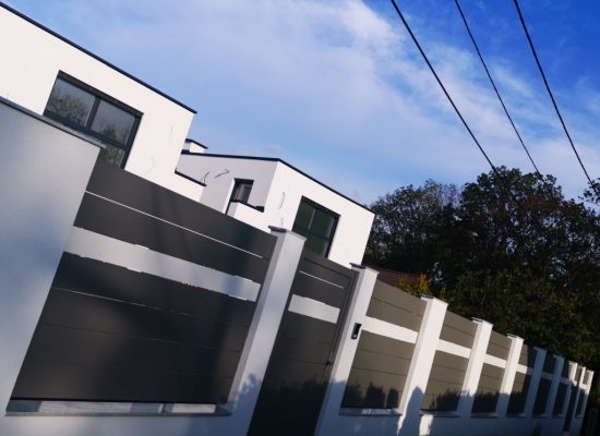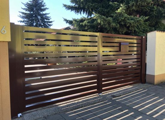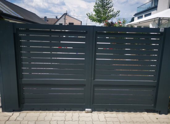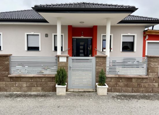 Horizontalzaun passt perfekt zum modernen Bauen. Ein Aluminiumzaun mit horizontalen Profilen ist die richtige Wahl für die Umzäunung eines Grundstücks mit einem einfachen Haus, vorzugsweise mit einem Flachdach.