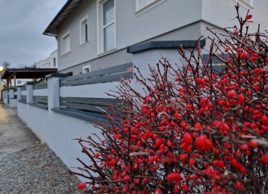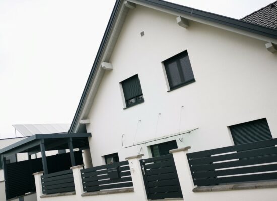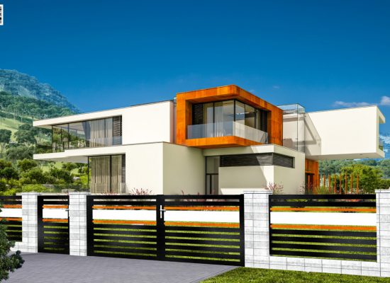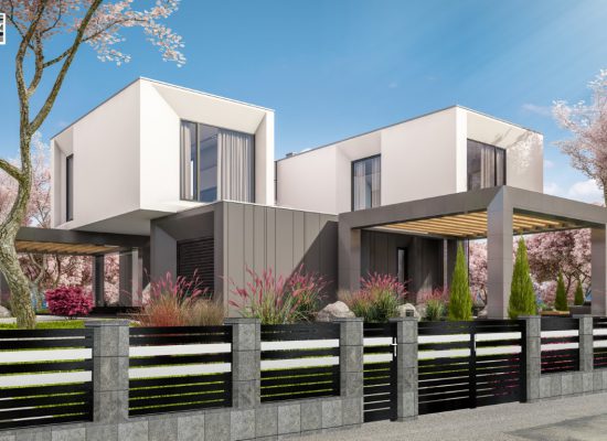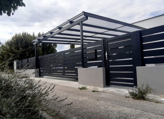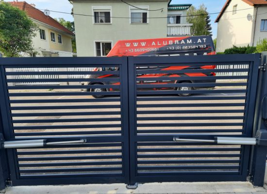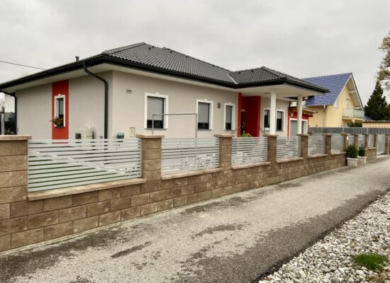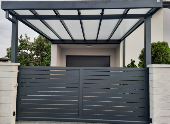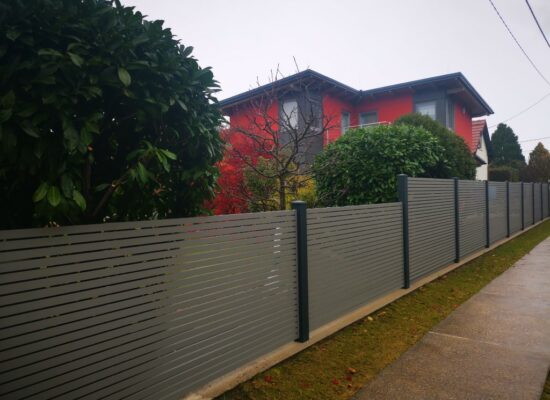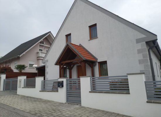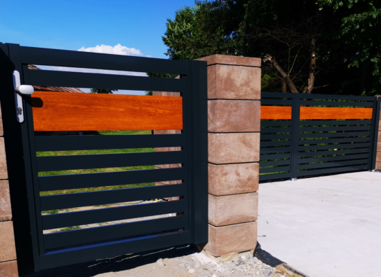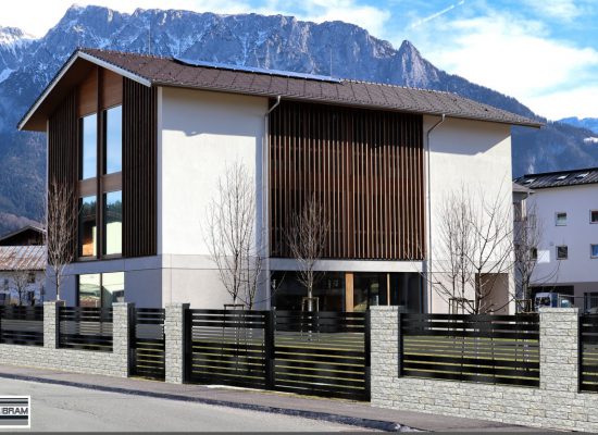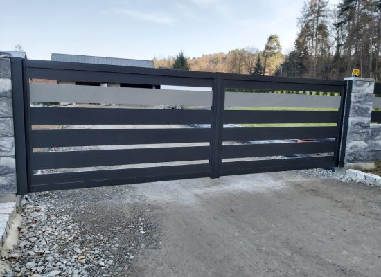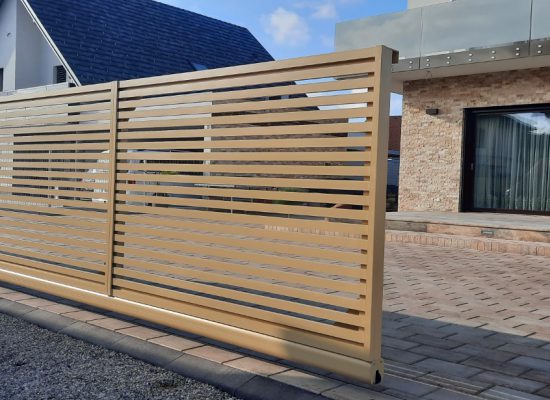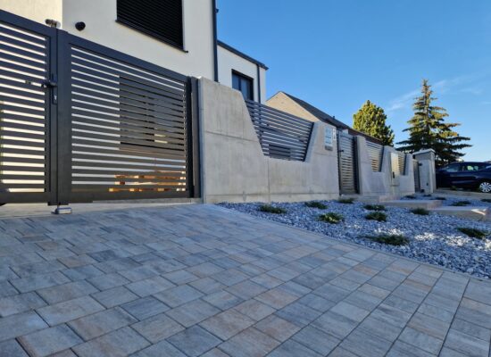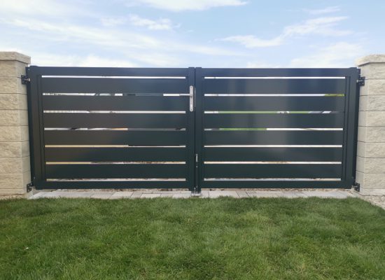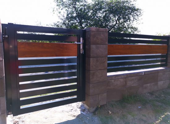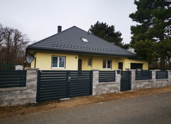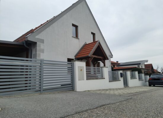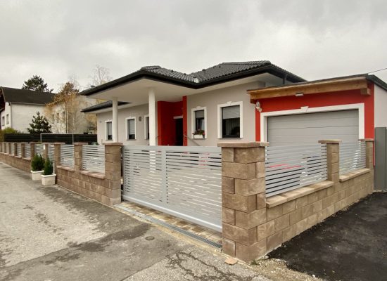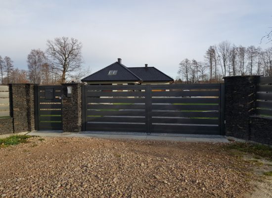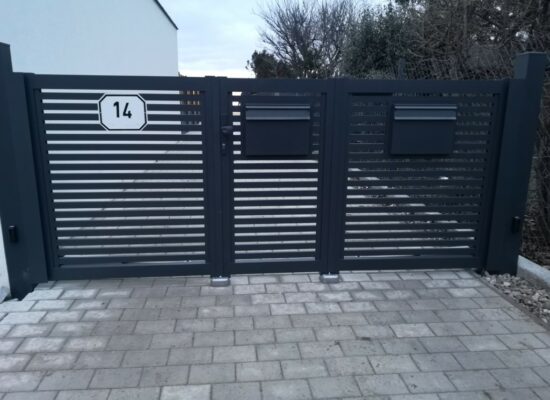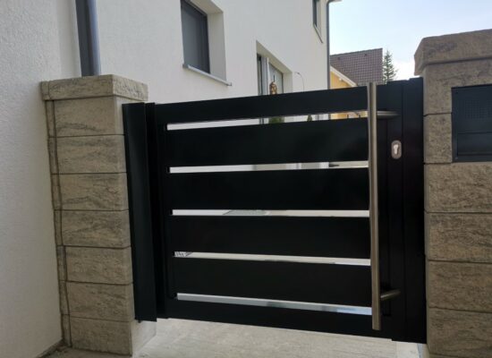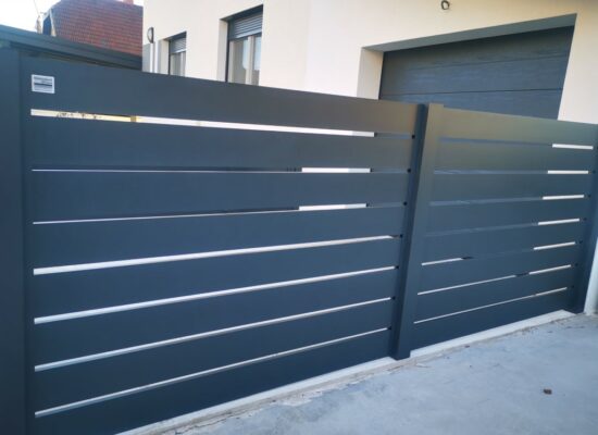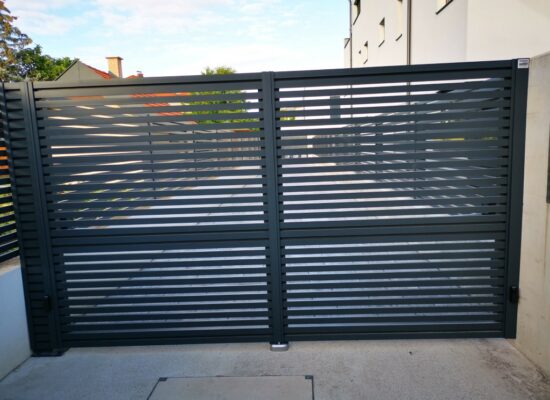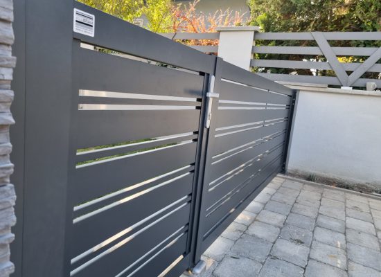 Horizontalzaun passt perfekt zum modernen Bauen. Ein Aluminiumzaun mit horizontalen Profilen ist die richtige Wahl für die Umzäunung eines Grundstücks mit einem einfachen Haus, vorzugsweise mit einem Flachdach.